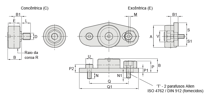 Os rolos são compostos por um rolamento de esferas de alta capacidade, de duas carreiras, tipo ranhura profunda, com um anel externo de seção robusta e perfil abaulado.